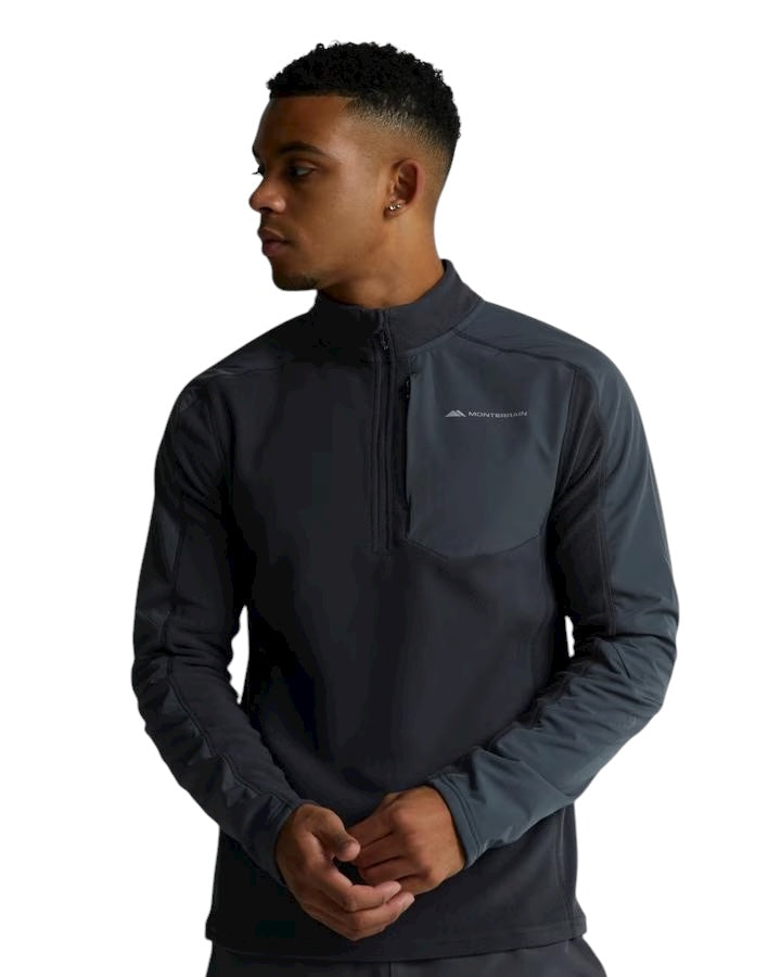 Monterrain Vital Micro Fleece Quarter Zip in Asphalt and Iron Gate. A vital cog in your activewear works, this quarter zip neck top is perfect for those quick runs or lung-busting sessions. Long-sleeved and made from lightweight yet cosy fleece fabric with contrast panels and reflective Monterrain branding to left chest to make sure you're safely visible even in low light conditions. Regular fit.